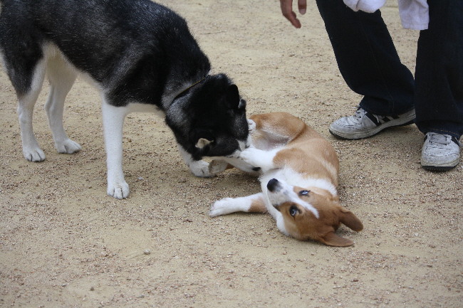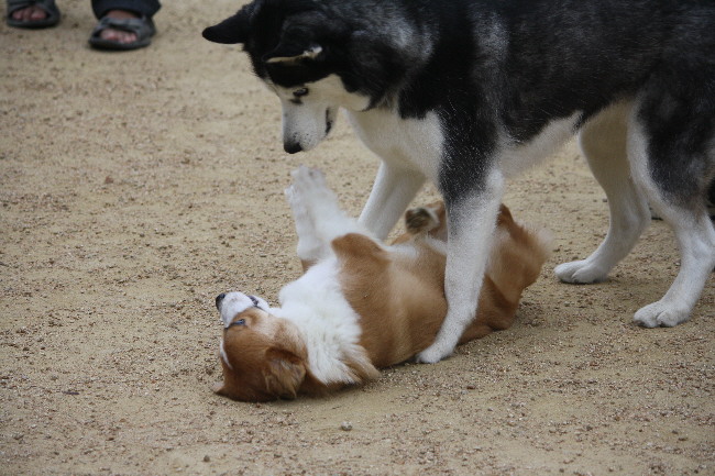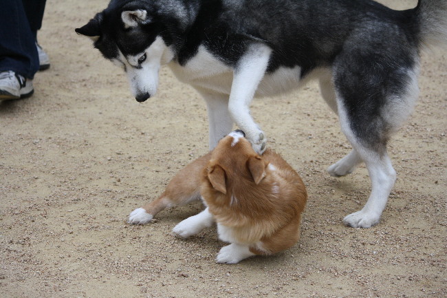 見た目は、やっぱり大きくて、怖そうだけど、コーギーちゃんにもやさしく遊んであげられるんですね♪すばらしい!!!(*´∇`*)