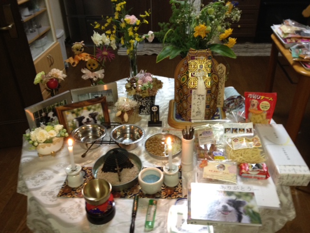 魂入れも終わりお坊さんから本位牌と遺影を受け取る時に、最後まで大人しくしていたジョンを褒めていただきました。