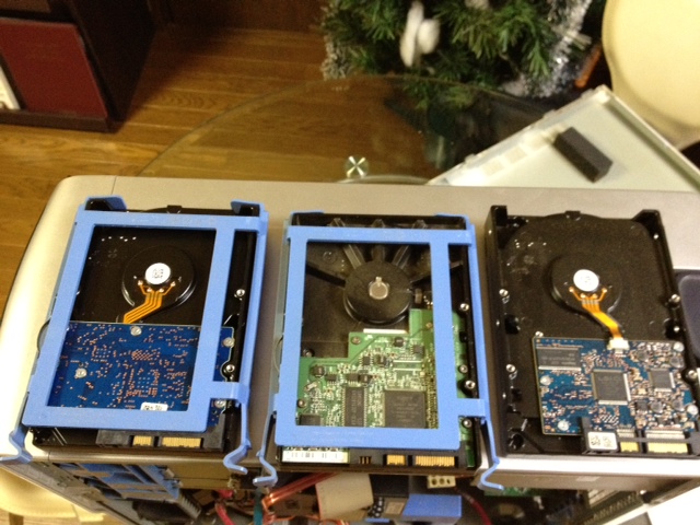 左から新HDD、真ん中不都合のあるHDD、増設したHDDです。