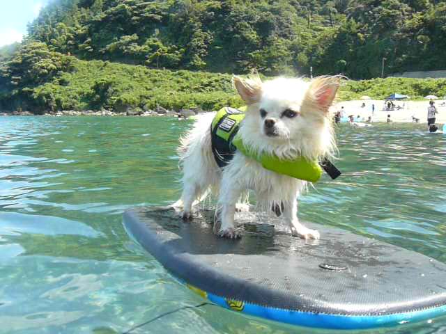 そんなクッキー君とは対照的に、クッキー君の兄妹犬のビッグチワワのチー君はサーフィンUSA中w