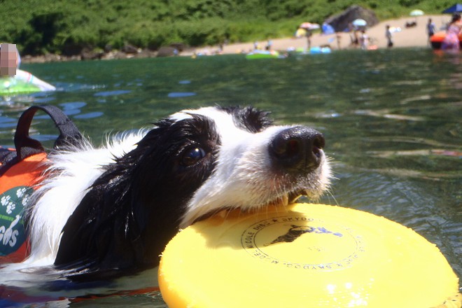 ハスキーちゃんを撮ってて後ろに気配を感じたのでカメラを向けると、ボーダーコリーがディスクを咥えて泳いできてました(笑)