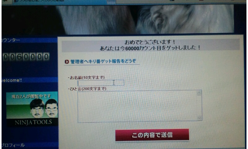 ちなみにこの画面、うちのキリ番を踏んだ方ならご存知だと思いますけど、急に現れるので結構ビックリしちゃいます(笑)