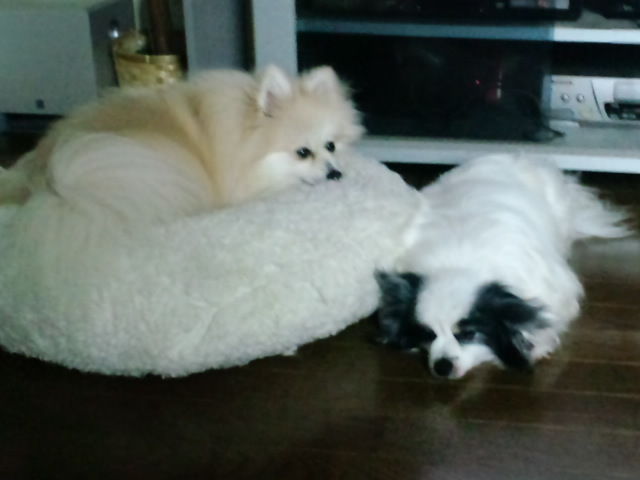パピはいつもジョンにチョッカイを掛けられて逃げる(避ける)んですけど、寝る時はわざわざこんな感じでジョンの近くに行き寝る事が多いんです。