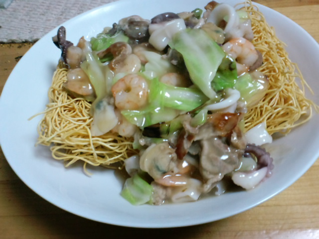 すごいですね、まささん、お料理上手ですね。皿うどんに乗っている具もまささんの手作りなんですか。タコとかエビとか貝(?)も入ってすごいゴージャスだし、味付けもおいしそうですね。私、皿うどんって食べたことがないんですけど、これを見て食べてみたくなりました。ポリポリの麺に具を乗せてたべにくそうだし、何がおいしいんだろうって思ってたんですけど、実はおいしいんですね!