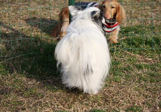 ネット越しにダックス君と挨拶
