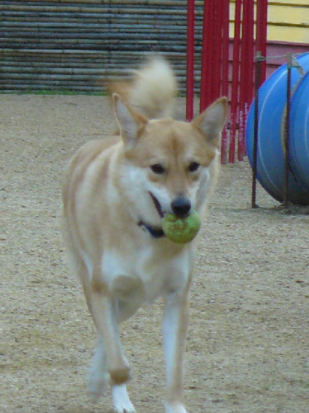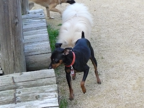 このコーギー君、ランに入ってきて挨拶もそこそこにいきなりジョンと追いかけっこが始まりました。