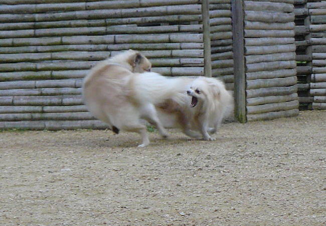 二度程挨拶しに来てくれたワンコに少し威嚇する素振りを見せましたが、(゚Д゚)ゴルァ!! と叱るとすぐにやめたし相手の子もすんなりと退いてくれたので喧嘩する事はありませんでした。