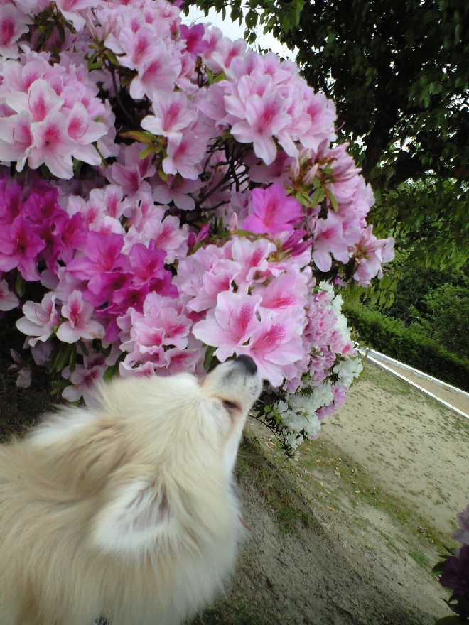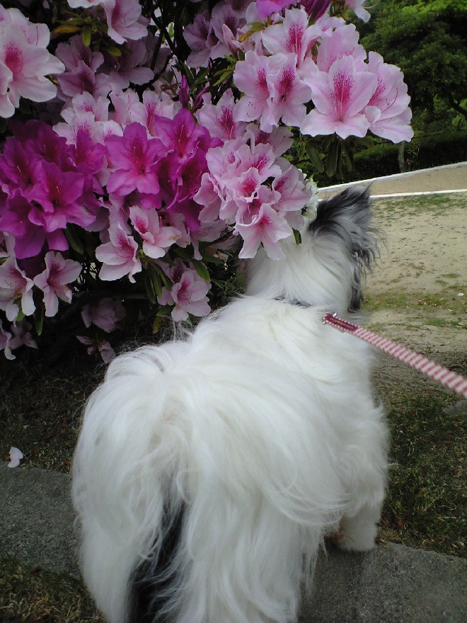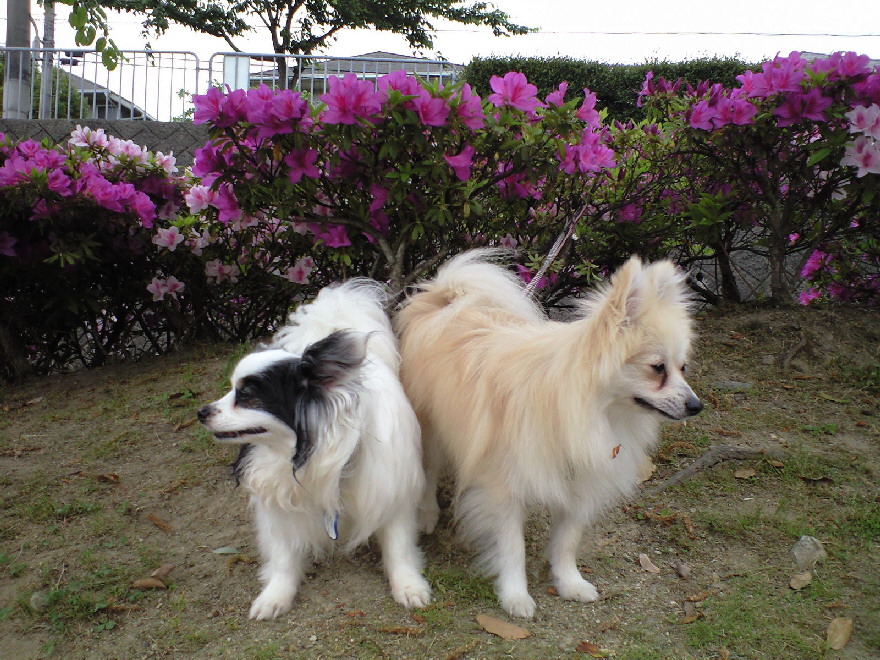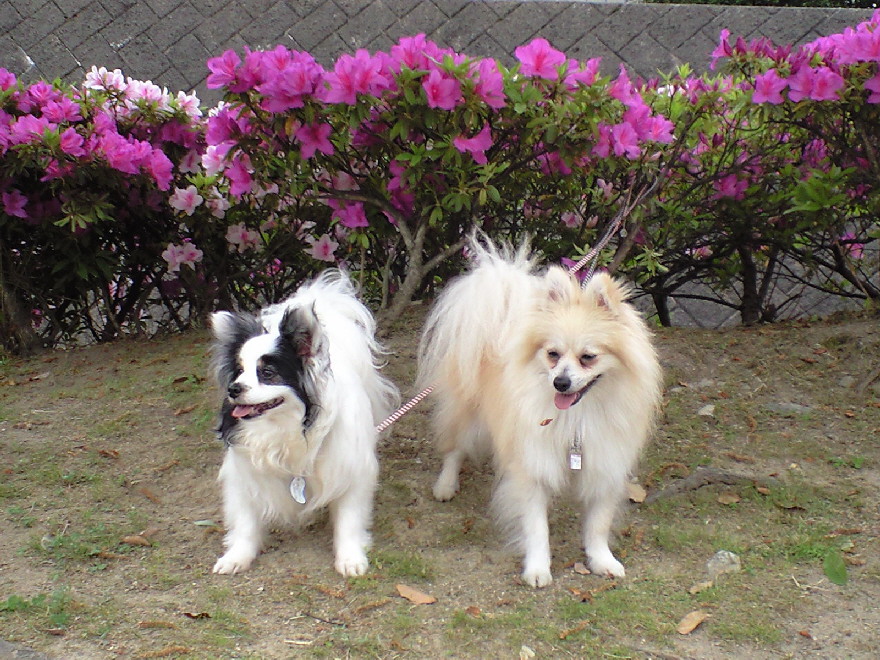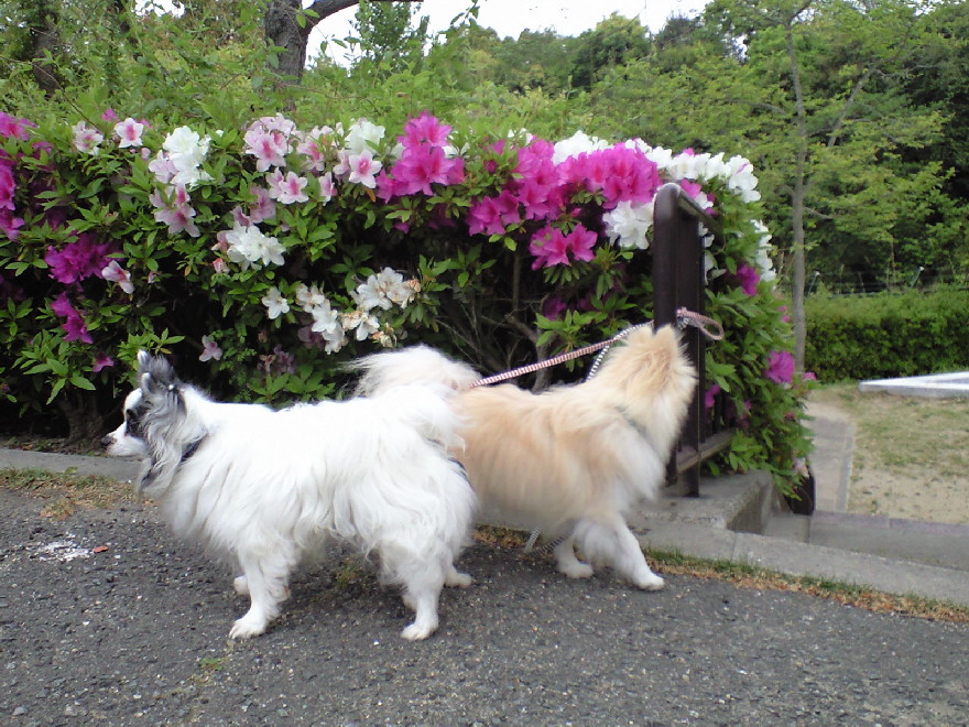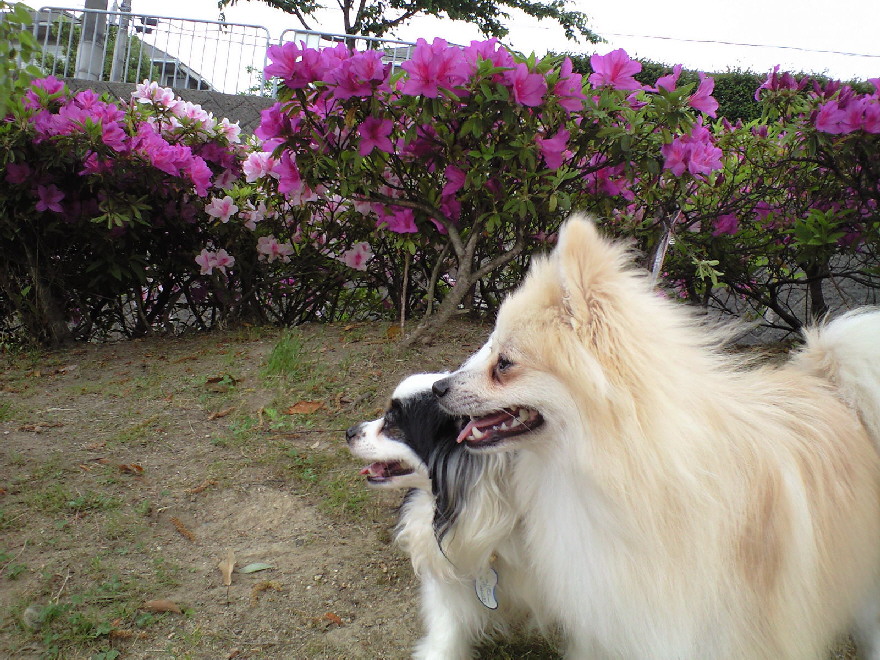 みなさんのブログで花をバックにいい写真をUPしているのをよく見たので、うちもやってみようと若達を散歩がてら公園に連れ出しました。