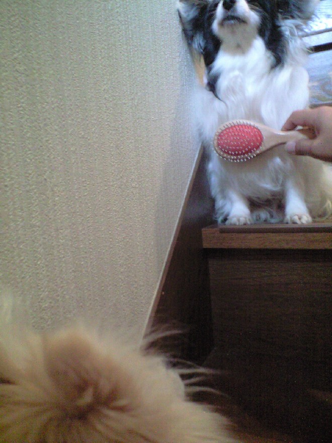ジョンは階段の中腹にある踊り場、パピは踊り場から3段目辺りに座らせてブラッシングを始めました。