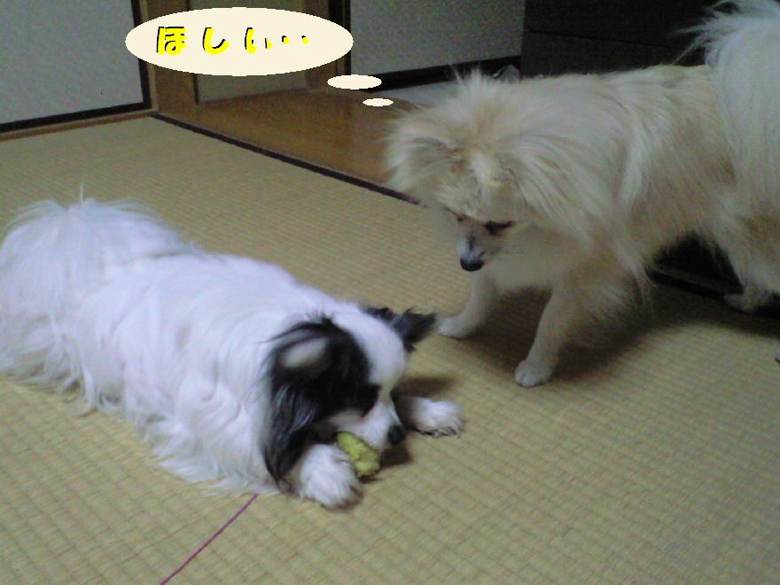 パピはどういう訳か、アキレス等食べるのに時間のかかるおやつは、自分のを食べきる前にジョンのを欲しがります。