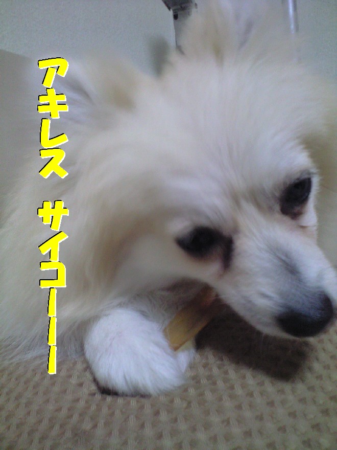 今日も二度ほどジョンがソファからアキレスを落とした隙に、自分の安全地帯に持って行ってジョンのを食べてました(^^;)