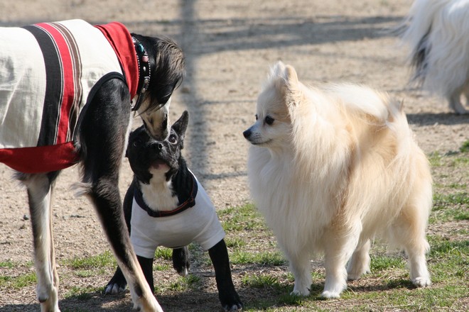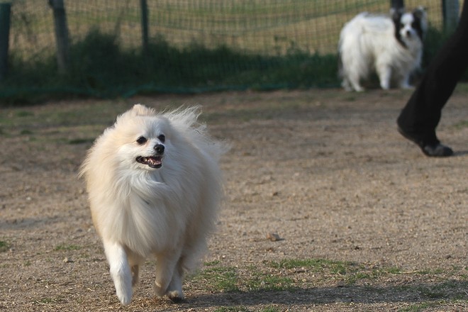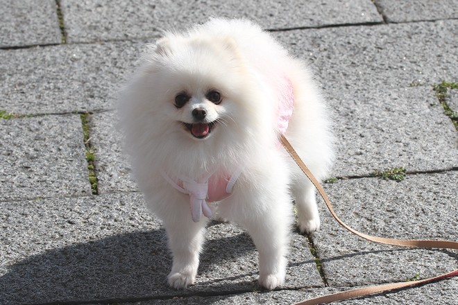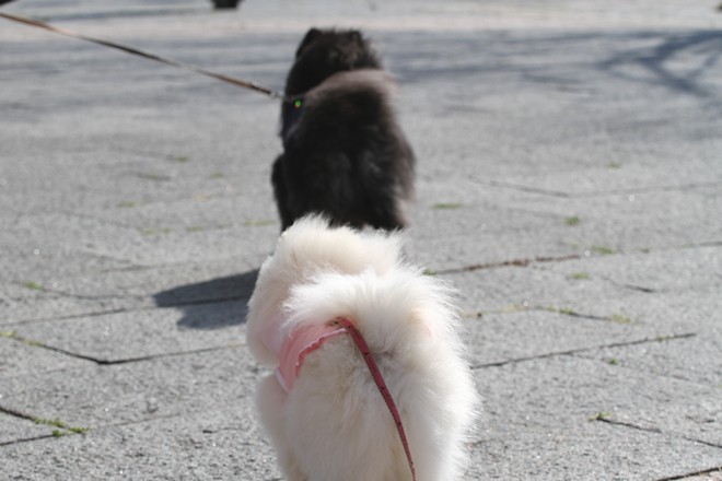 前を歩いてる黒ポメがくっきー君です。