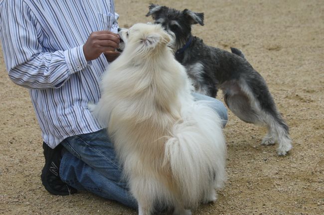 ランビのおっちゃんさんにオヤツを貰うジョンとパピ(ジョンで隠れてしまってるけど)と殿