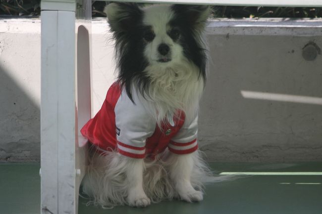 パピはうちに友人が来た時も、こうしてテーブルの下や陰に隠れる事が多いのです(昔に比べたらマシになったけど)