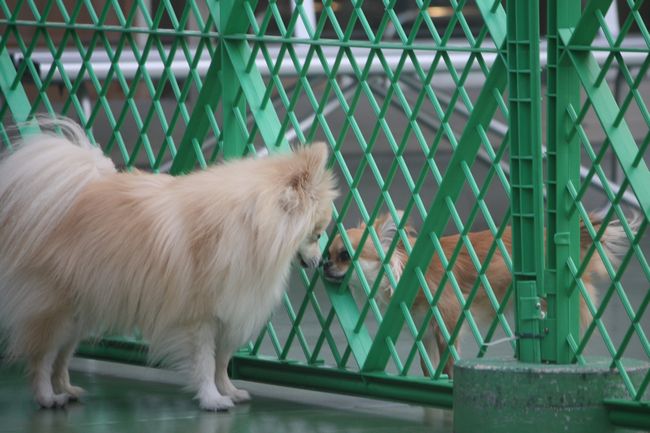ジョンは隣のランにいたホテルの預かりのチワワ君とご挨拶。