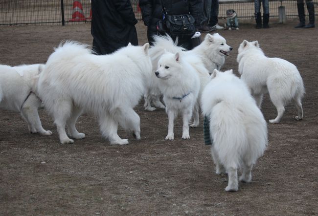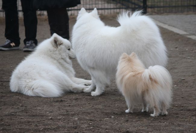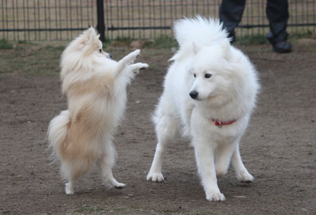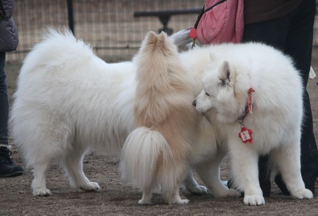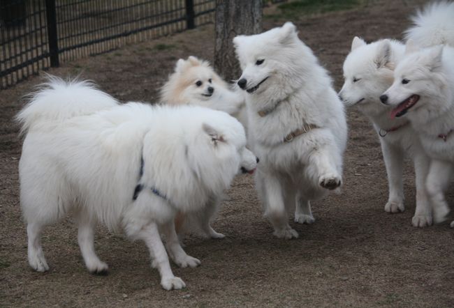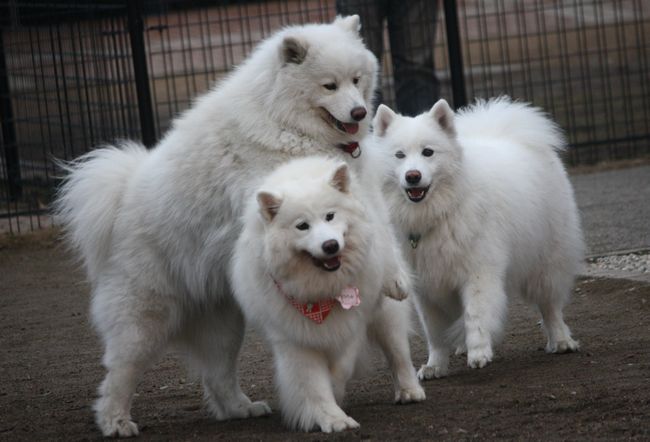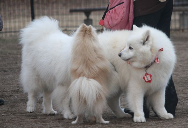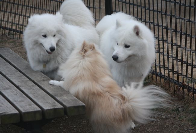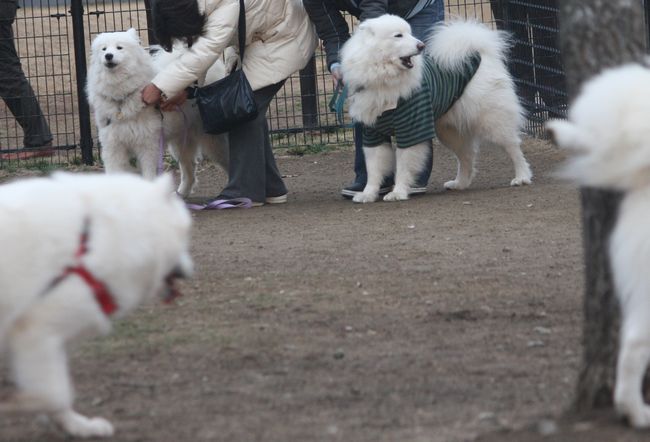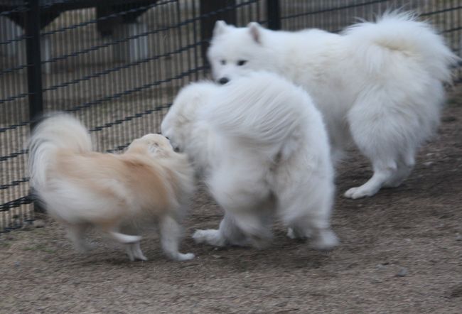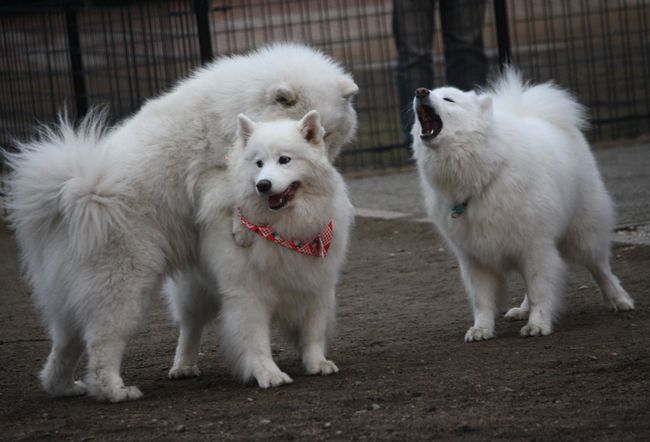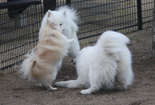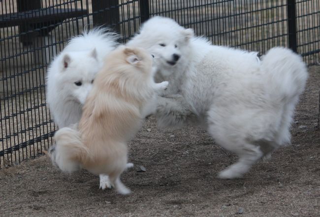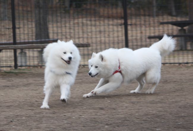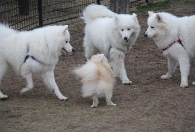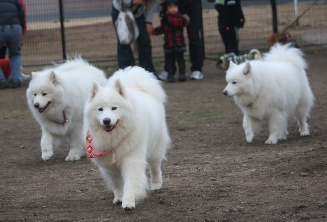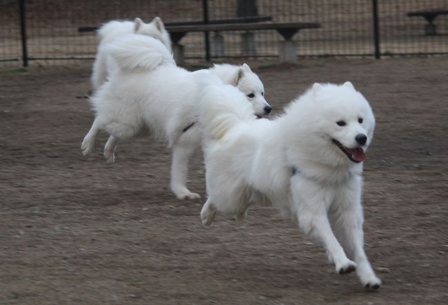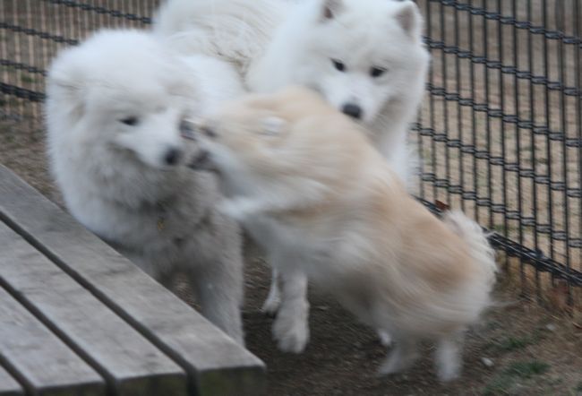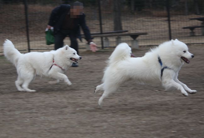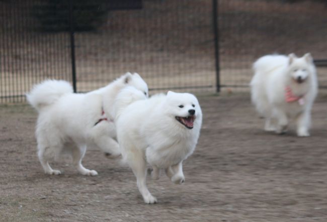 さて、サモエドさんたちはテンションが上がってきたようで追いかけっこが始まりました。