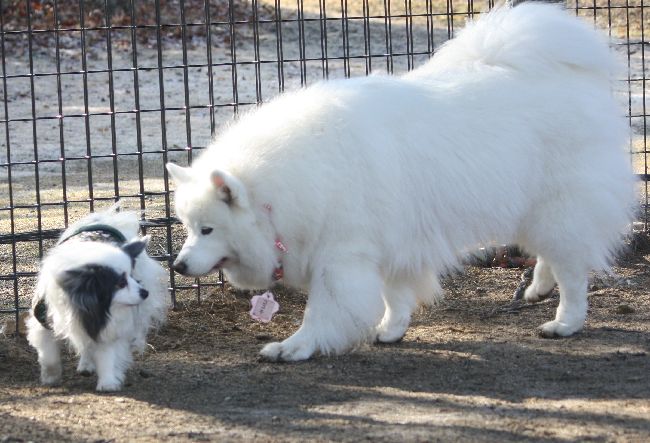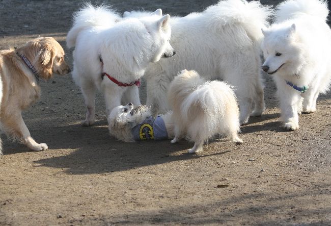 桃太郎君は嬉しいと大型犬小型犬問わずにゴロゴロして相手にすり寄って行くんだけど、動画では追い掛けられたりサモパンチを受けてますよね(^^;)