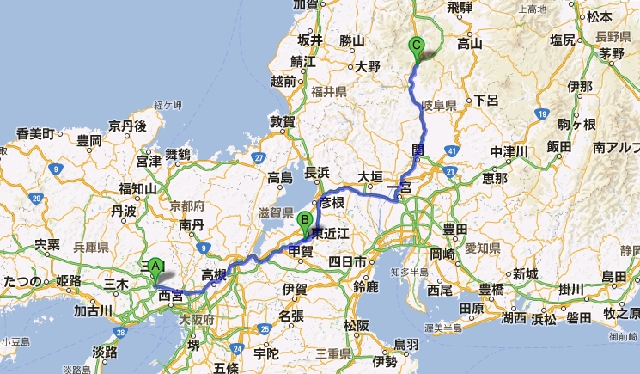 Aが出発地、Bが黒丸P.A、Cがひるがの高原S.Aです。
