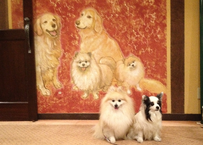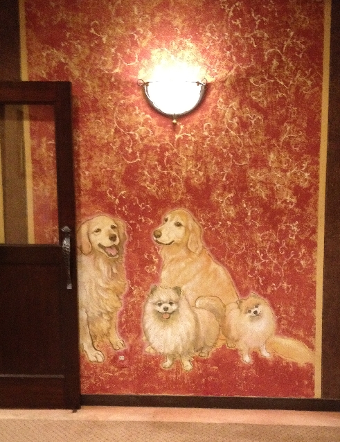 ホテルの入り口を入ってすぐ左手に足洗い場があるんですけど、その扉を開けると(ちょうど左に写っている扉)壁にゴールデンとポメの画が描かれています。