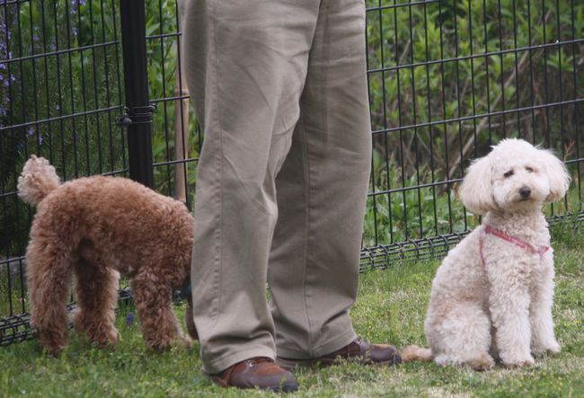 ジョンが入り口でトイプー君を待っている時、パピは先に入られた奥さん(入り口にいるのは旦那さん)に可愛がられていました。