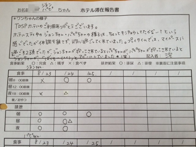8月の父のお通夜と葬儀の時にペットホテルに預けた時の報告書にも書かれていました。
