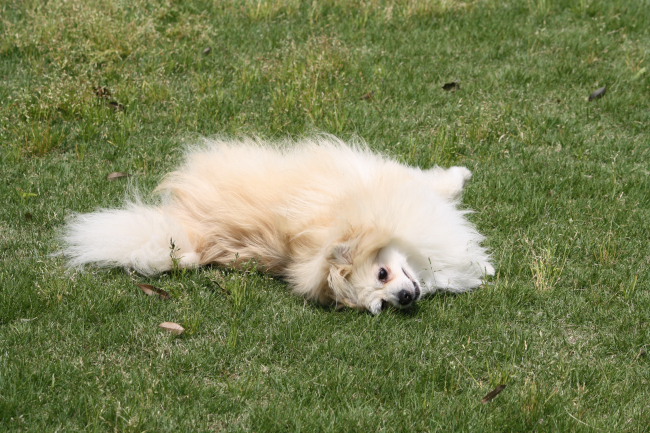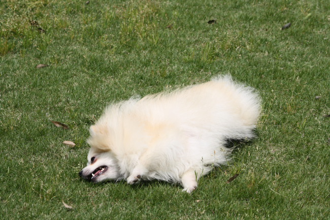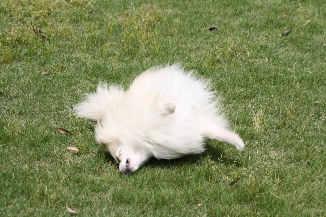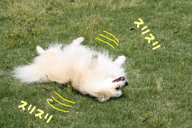 シャンプー後やフロントラインをつけた後には、家の中でこうして体を布団やソファに擦り付ける様にしますけど、外でするのを見たのはこれで2回目です(^-^)