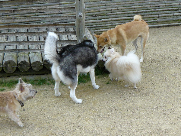 二度程挨拶しに来てくれたワンコに少し威嚇する素振りを見せましたが、(゚Д゚)ゴルァ!! と叱るとすぐにやめたし相手の子もすんなりと退いてくれたので喧嘩する事はありませんでした。
