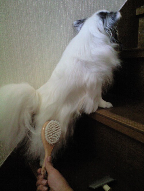 いつもこんな感じで自分は踊り場、ワンコは3.4段目位でブラッシングしています。