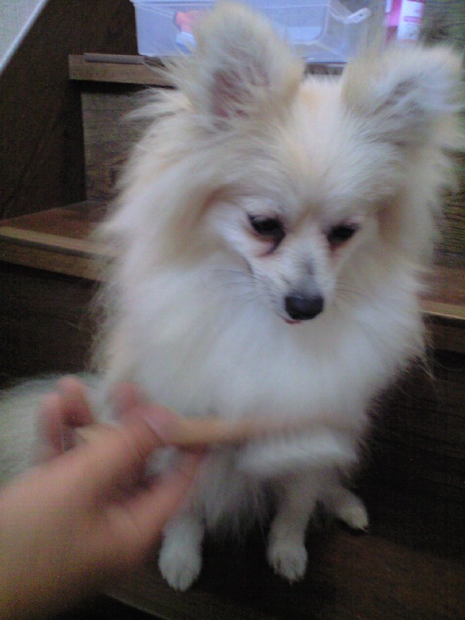 嫌いなブラッシングをたっぷり時間をかけてしたので、ご褒美におやつをあげ遊んであげました。